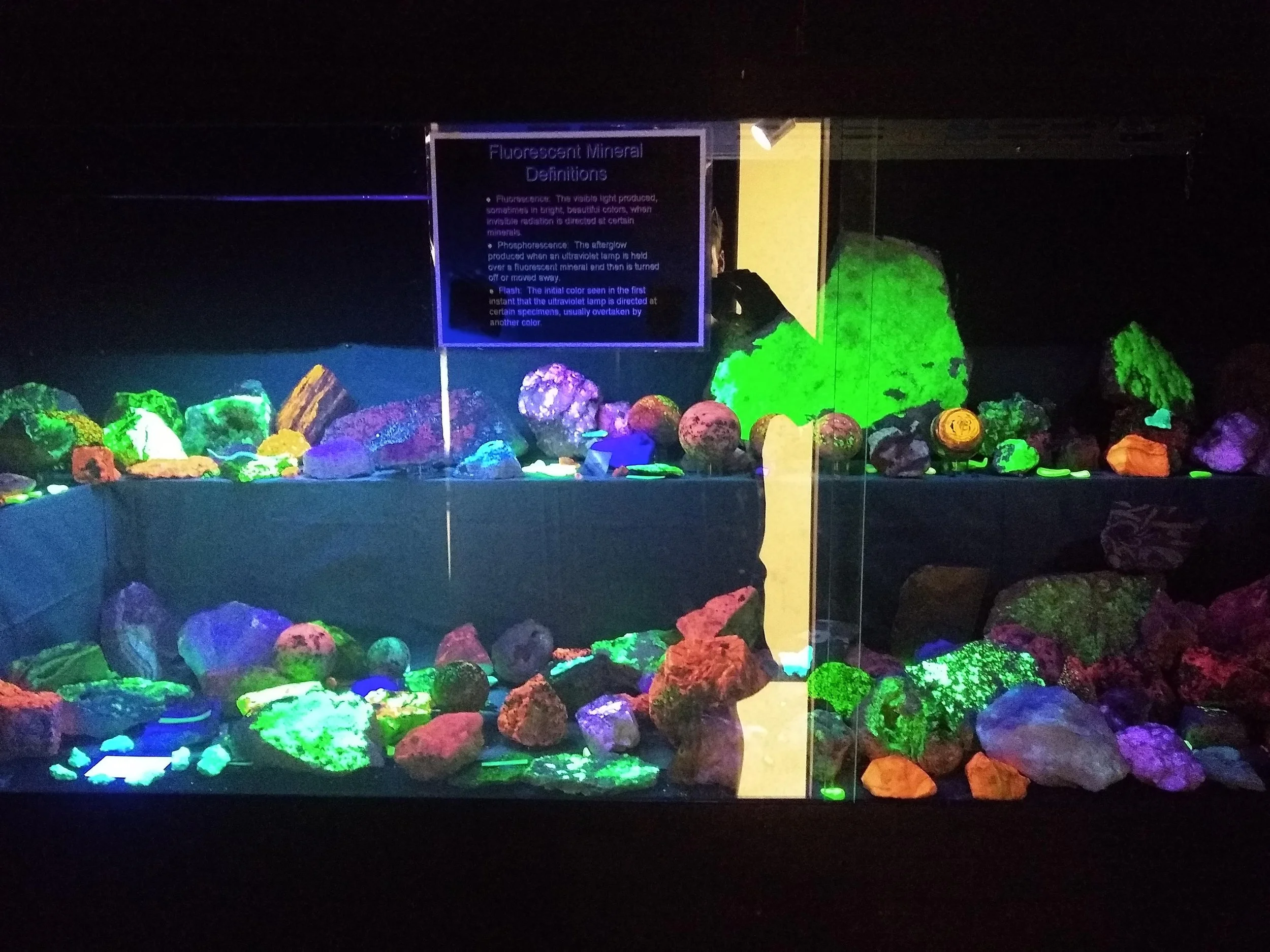 In a small, dark room to the side separated by a heavy curtain there is a case filled with fluorescent minerals. When the ultra-violet lamp above the minerals is turned on they glow neon shades of slime green and ember orange amid sour hues of purple and pink and pale yellow. I stand alone in the darkness peering into their case as though into the terrarium of some unusual creature. The minerals are bright and sickly, like wildflowers that have grown up from the toxic waste of a nuclear sewer, a bizarre bloom of mutant color.