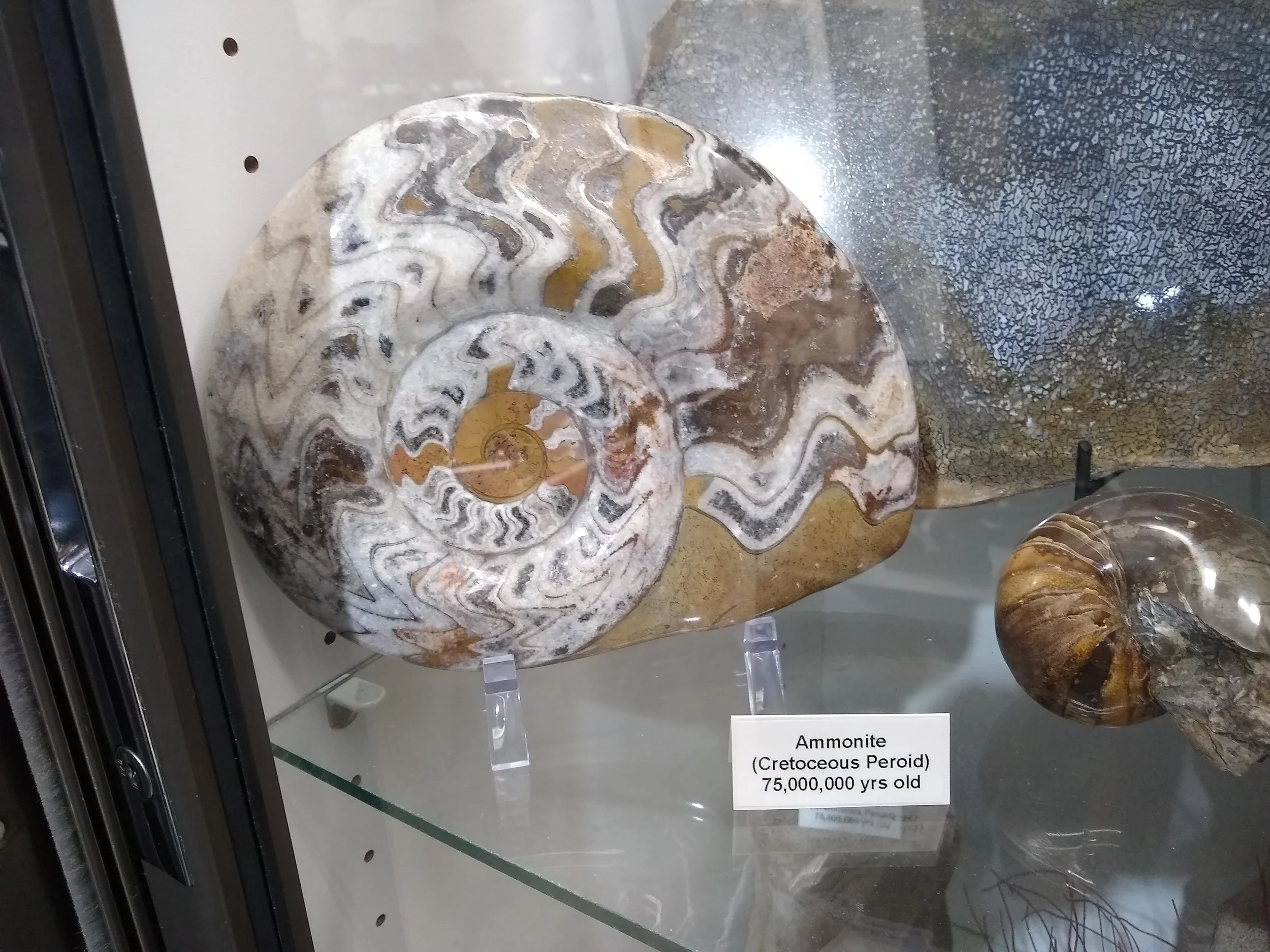 Fossils fill many shelves, just as varied and interesting as the minerals. There is a cast of a Tyrannosaurus mandible and a folded fish fossil. There is a slab of petrified dyno poo that is a golden coppery hue covered in a galaxy of clam-shaped splotches of color which are absolutely beautiful. There is a white-line collage of fossilized ferns on a page of gray granite.