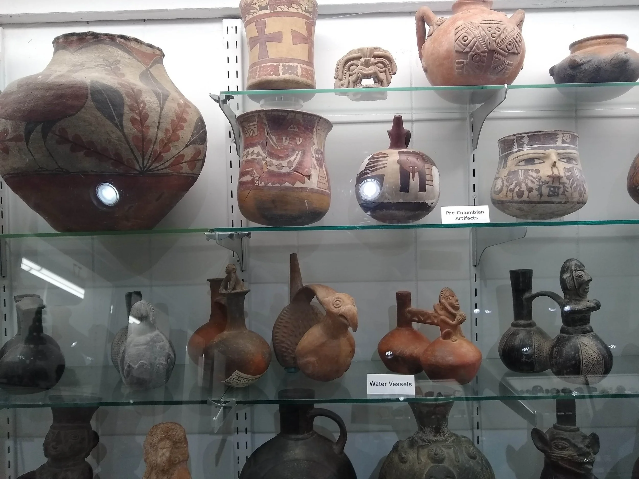 Cultural tokens from all over the world share space with the stones on the shelves. In a case of pre-columbian artifacts there is a tiny copper mask and bola weights, and prehistoric surgery tools made of obsidian. There are soapstone carvings of laughing old men and carved Amber elephants and little vials of engraved Jade.