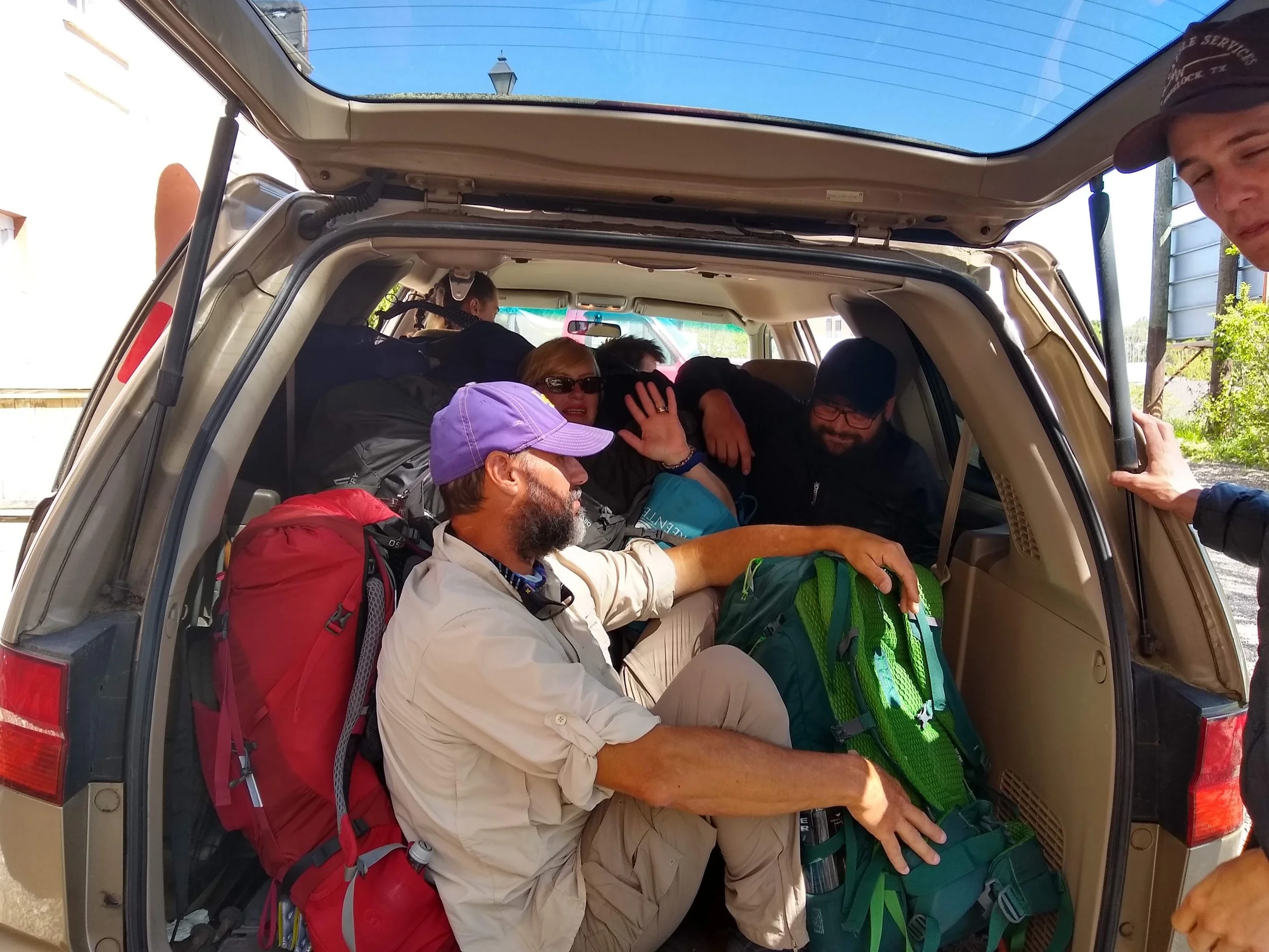 The hostel’s shuttle-vehicle is an old minivan from the eighties, and it fills up with so many hikers that one of the workers literally has to cram the bodies in and shove them together to get the door closed. Cajun has to climb into the very back of the van and scrunch into a ball so the trunk can be shut. Once full, the van wheezes off down the road sunk low on its shocks, the fuzzy smudge of Cajun’s face smiling from the back window, amused at the ridiculousness of it all.
