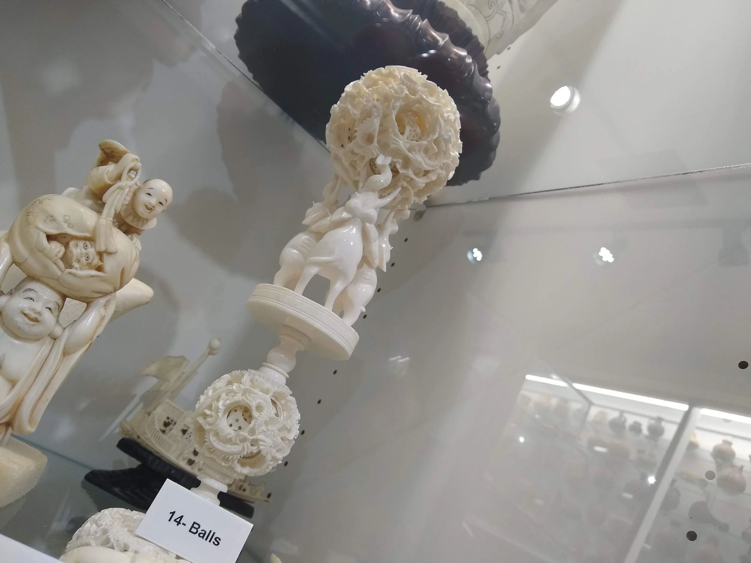 Each item is a wonder of craftsmanship I could spend hours looking at, but one in particular entrances me. It is a statue of fourteen balls all carved from the same piece of Ivory. The main ball is maybe the size of a baseball, and held aloft on the trunks of three miniature elephants. The other thirteen balls are inside of the first, each one carved somehow within the larger balls. Through small openings you can see sections of the balls within. I look closer and notice that the elegant, lace-like designs I took to be abstract ripples are actually dragons! It has all the intricate interconnectedness of clockwork gears combined with the madness of shrinking space. It is like a descending staircase that goes inward instead of down.
