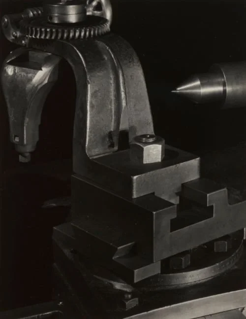 Also present within the images is a vague sense of the sexual. The frames are filled with naked steel on naked steel, with the couplings and cominglings of various components. There is the sensuality of chamfered edges, the ‘coming together’ of grooves and gearwheels. The impressionistic resonance of repetitive motions, unseen but felt behind the eyes. Here, lathe and drill are not presented in their entirety but reduced down to subcomponents, isolated from the larger apparatus with a fetishistic focus, like closeup shots of genitalia. See the phallic protrusion at the top right corner of Lathe, and the mounded curve of metal directly across from it more than slightly reminiscent of a vulva. The lower half of the photograph is a busy mess of bolts and blocks and discordant angles which conjures the intimate intricacies of feminine interiors, a cubist invocation of the female undercarriage. This labia-like collection of overlapping surfaces and slotted space reminds us we are peering into the reproductive organs of modernity, and our eyes finger it with wonder and curiosity. We feel a mysterious pull from these images as strong as any lurid picture. Like the vagina, the lathe is both fascinating and confounding, containing within it the elusive possibility the mind senses among the mystery of hidden parts and penetralia. Long hallways and parted legs. (See also Paul Outerbridge)